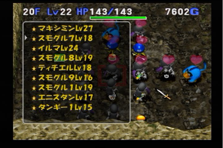 モンハウを見つけて壊滅後、あるいはモンハウがなかったとして、まずするべきことは罠チェックです。この階層でするべき最優先事項は毒矢の罠・錆びの罠を探すこと。もちろん狙いはスモコンによるスモグル捕獲、そしてレベル20に向けての経験値獲得です。モンハウがあった場合はまずそこで目的の罠が見つかると思いますが、なければ最悪の場合罠自体が存在しない可能性があります。そうなったら自力でスモグルを起こすしかありません。もしスモコンが出来るような状況だったとしても、野生のスモグルは出来る限りポポロで倒して捕獲出来る可能性を高めておくべきでしょう。